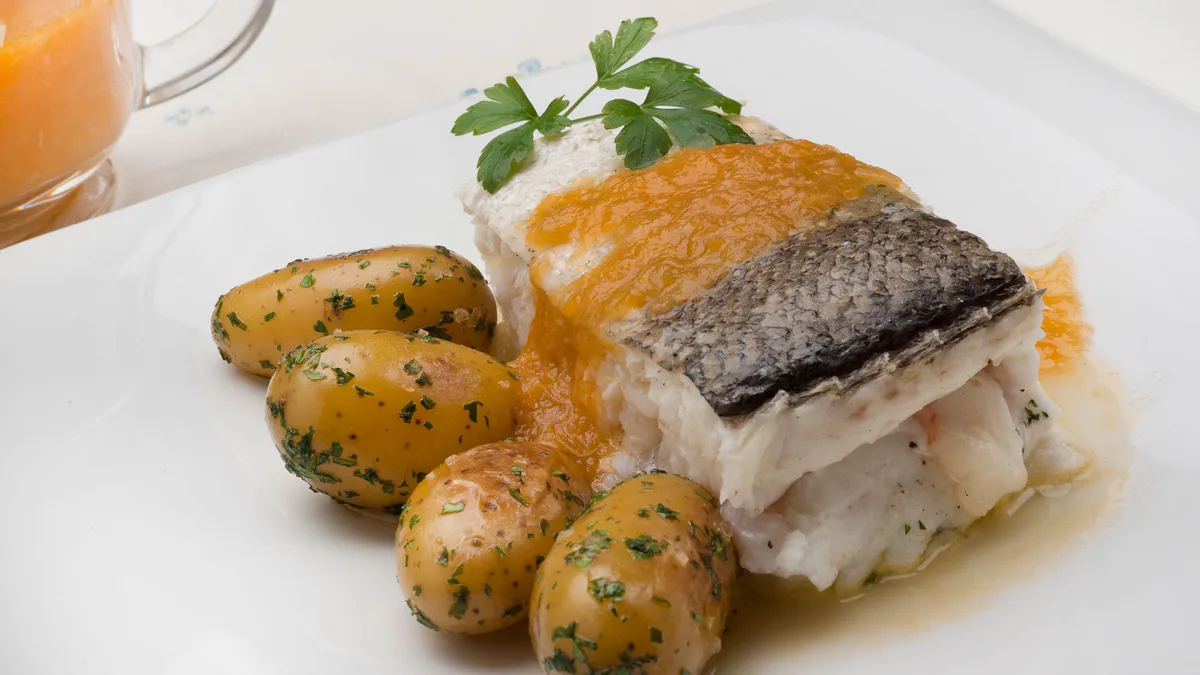 Sirve el pescado y vierte el juguito que ha soltado en el horno. Acompáñalo con las patatas y la salsa. Decora con una hojita de perejil.
