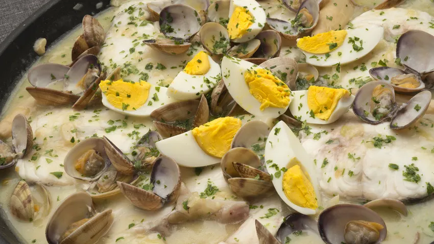 La merluza a la koxkera, que también se conoce como merluza a la vasca o merluza a la donostiarra, se prepara con almejas, espárragos, huevo cocido, cebolleta y guisantes.