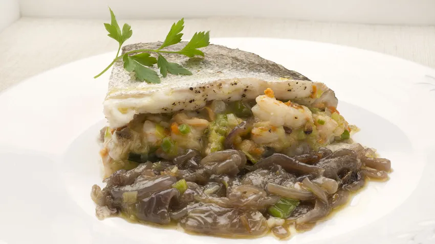 Karlos Arguiñano elabora una receta de lomos de merluza al horno rellenos de mejillones, gambas y verduras acompañados de cebolla pochada.