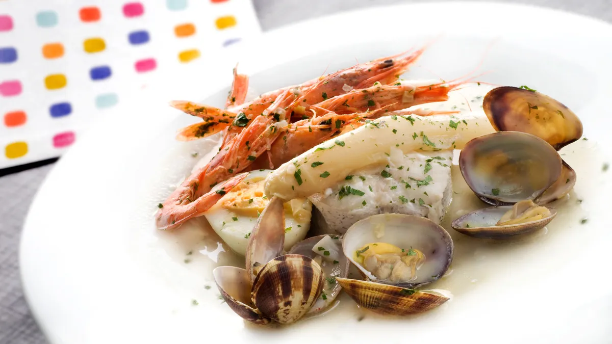 Receta de merluza en salsa verde con marisco de Eva Arguiñano. Se trata de un plato tradicional de merluza cocida en salsa verde acompañada de almejas y gambas.