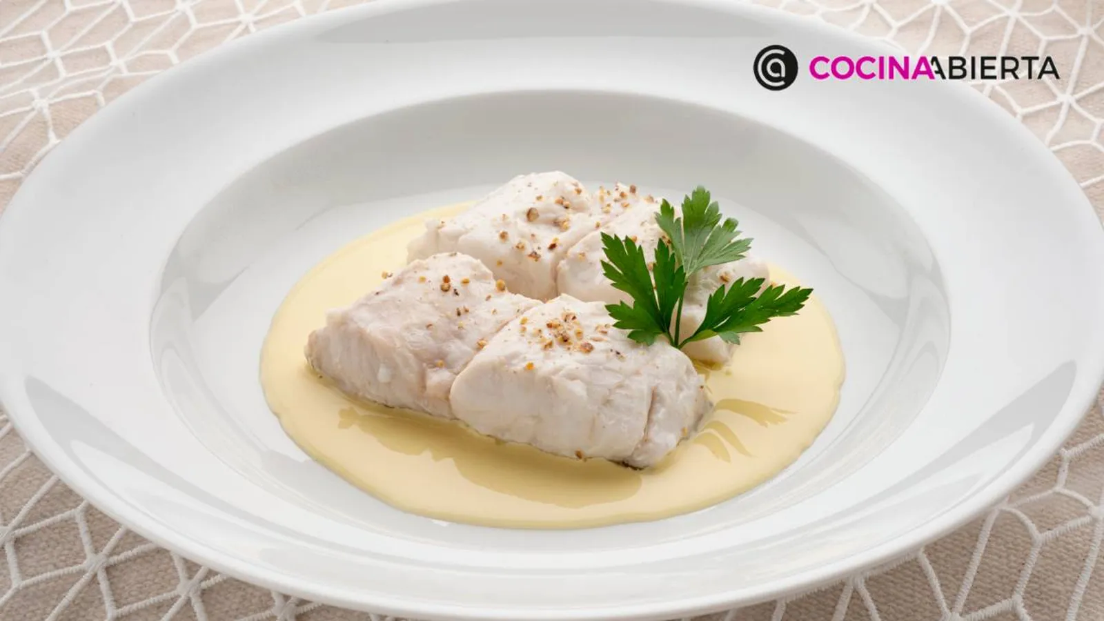 Sirve la salsa en el fondo de los platos, pon 2 trozos de pescado encima y decóralos con unas hojas de perejil. ¡A disfrutarlo!
