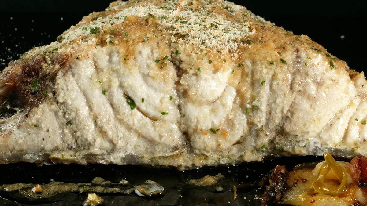 Receta de mero al horno con patatas panadera y refrito de ajo y cebolla de la mano de Karlos Arguiñano.