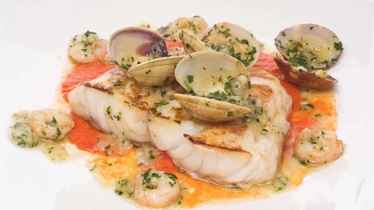 Receta de mero salteado con almejas y gambas y acompañadas por dos salsas: salsa roja y salsa verde. Plato preparado por Eva Arguiñano en Hoy cocinas tú.