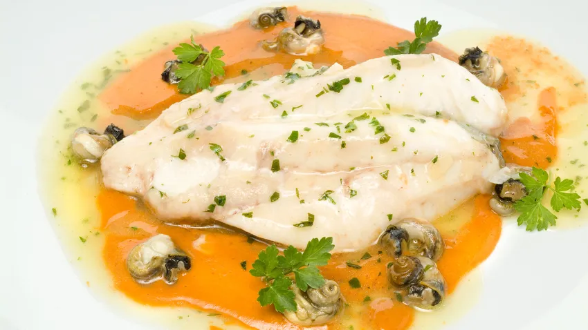 Receta de pez de San Pedro cocinado en salsa verde y una salsa de pimientos choriceros y acompañado de bígaros. Plato del cocinero Bruno Oteiza.