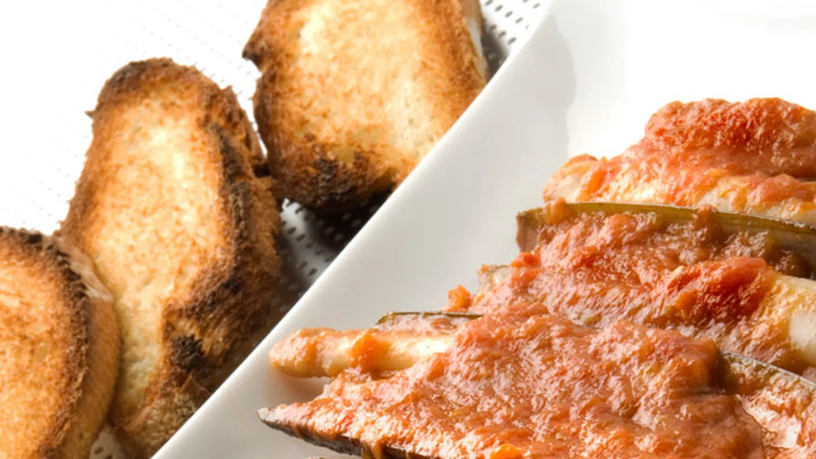 Sirve las navajas con su salsa de tomate, acompaña con el pan tostado y decora con una hojita de perejil.