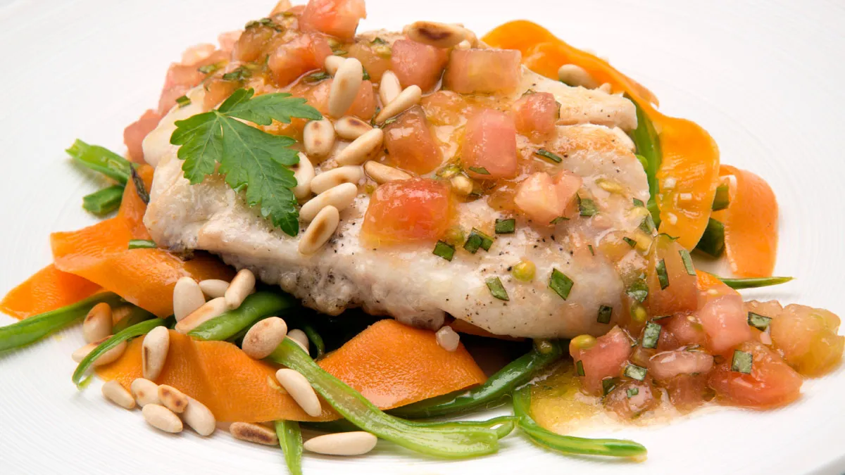 Receta de Karlos Arguiñano de pez San Pedro cocinado a la plancha acompañado de una ensalada templada de tomate, zanahorias, judías verdes y piñones tostados.