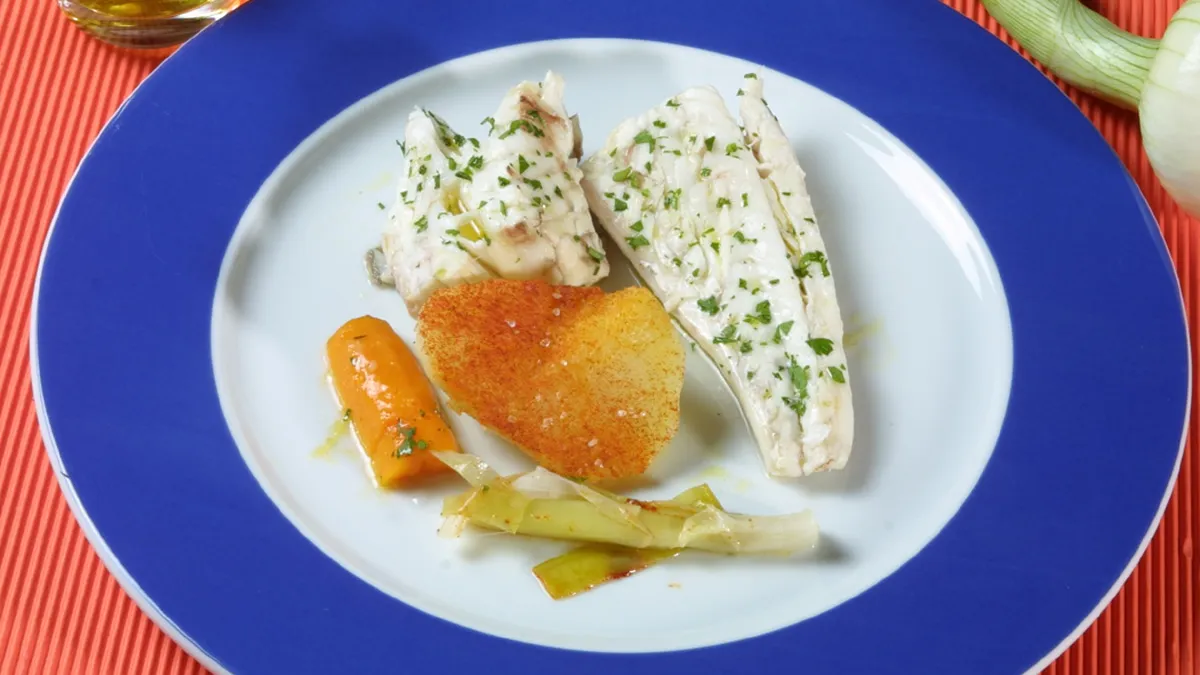 Receta de perlón cocinado con verduras, patatas, cebolletas y puerros con un toque de pimentón.