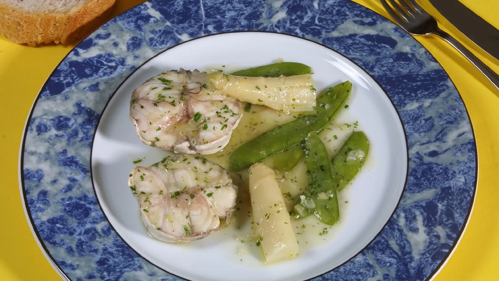 Pica finamente la cebolleta y los ajos y ponlos a dorar en una cazuela. Añade un poco de harina y rehoga brevemente. Sazona las rodajas de pescado e incorpóralas. Añade el vino blanco, 2-3 cacitos de fumet, los guisantes y los espárragos cortados por la mitad. Cocina brevemente, voltea las rodajas de pescado, espolvorea con perejil picado y sirve.