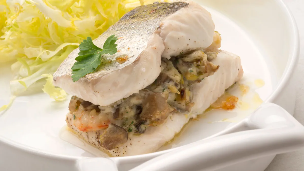 Receta de Karlos Arguiñano de pescadilla rellena de gambas, setas y ajos frescos, cocinada en el horno y acompañada de ensalada de escarola.