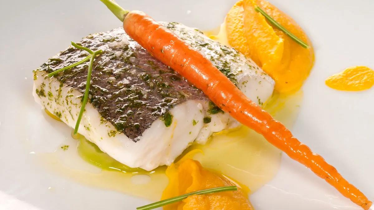 Pescadilla al vapor con puré de zanahorias al curry