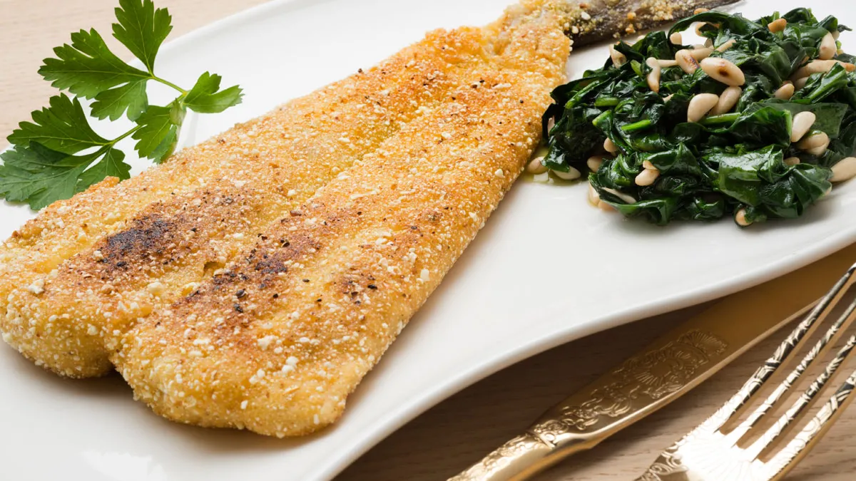 Receta de Karlos Arguiñano de pescadillas especiadas y rebozadas en polvo de palomitas acompañadas de espinacas salteadas con piñones.