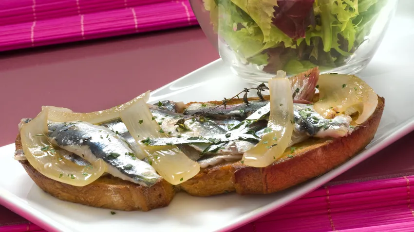Tuesta las rebanadas de pan en el horno. Sirve una rebanada de pan, coloca encima las sardinas y las verduras reservadas. Acompaña con la ensalada.