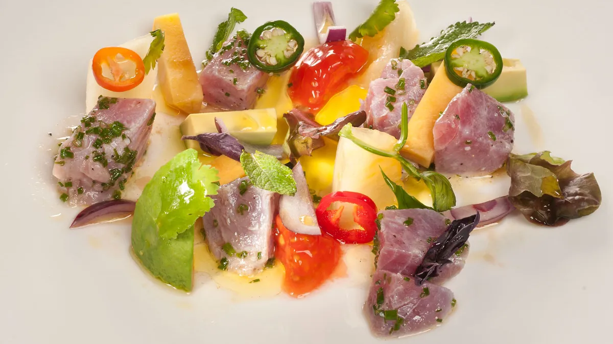 Receta de Bruno Oteiza de pescado azul en salmuera, en este caso atún rojo, acompañado de melón, melocotón, aguacate, cebolla, chiles y cebollino, un plato sencillo y muy refrescante.