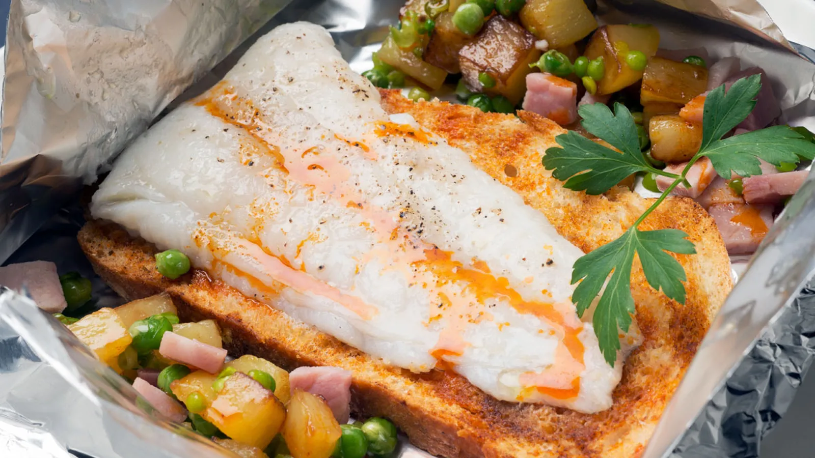 Pela las patatas y córtalas en daditos pequeños. Ponlos a freír en una sartén con aceite. Sazona. Cuando pasen unos 5 minutos, añade los guisantes, coloca la tapa y cocina todo junto durante 8-10 minutos más. Retira el aceite e incorpora el jamón cocido cortado en daditos y saltea. Pon a punto de sal. Sirve el pescado y acompáñalo con el salteado de patatas, guisantes y jamón. Espolvorea con perejil picado y decora con el aceite reservado (puedes decorar con una hoja de perejil si deseas).