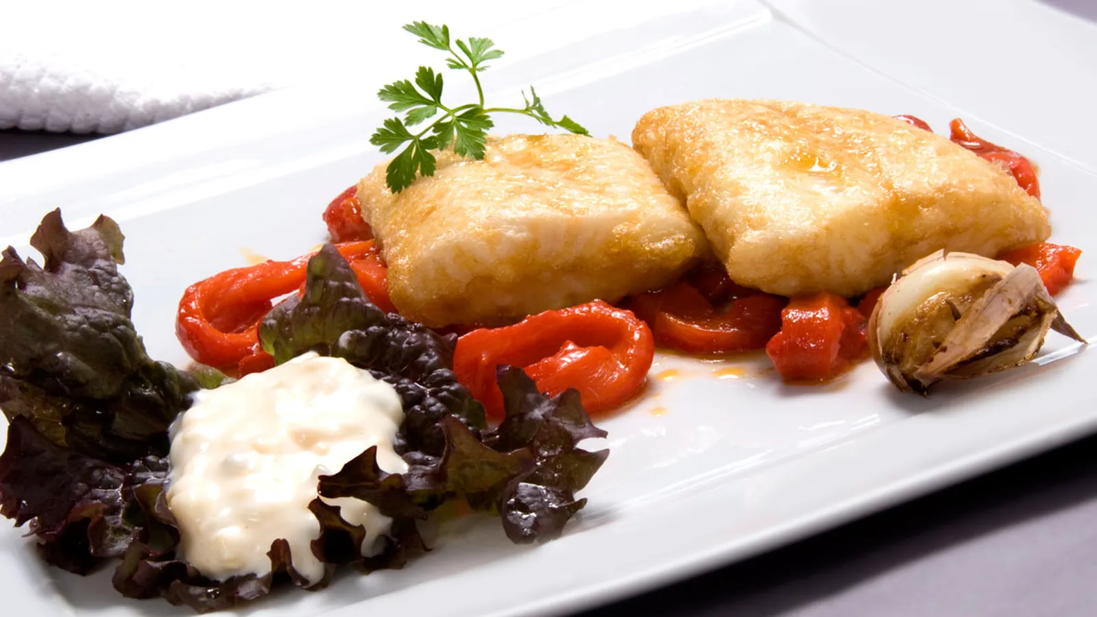 Pescado rebozado con morrones y salsa tártara