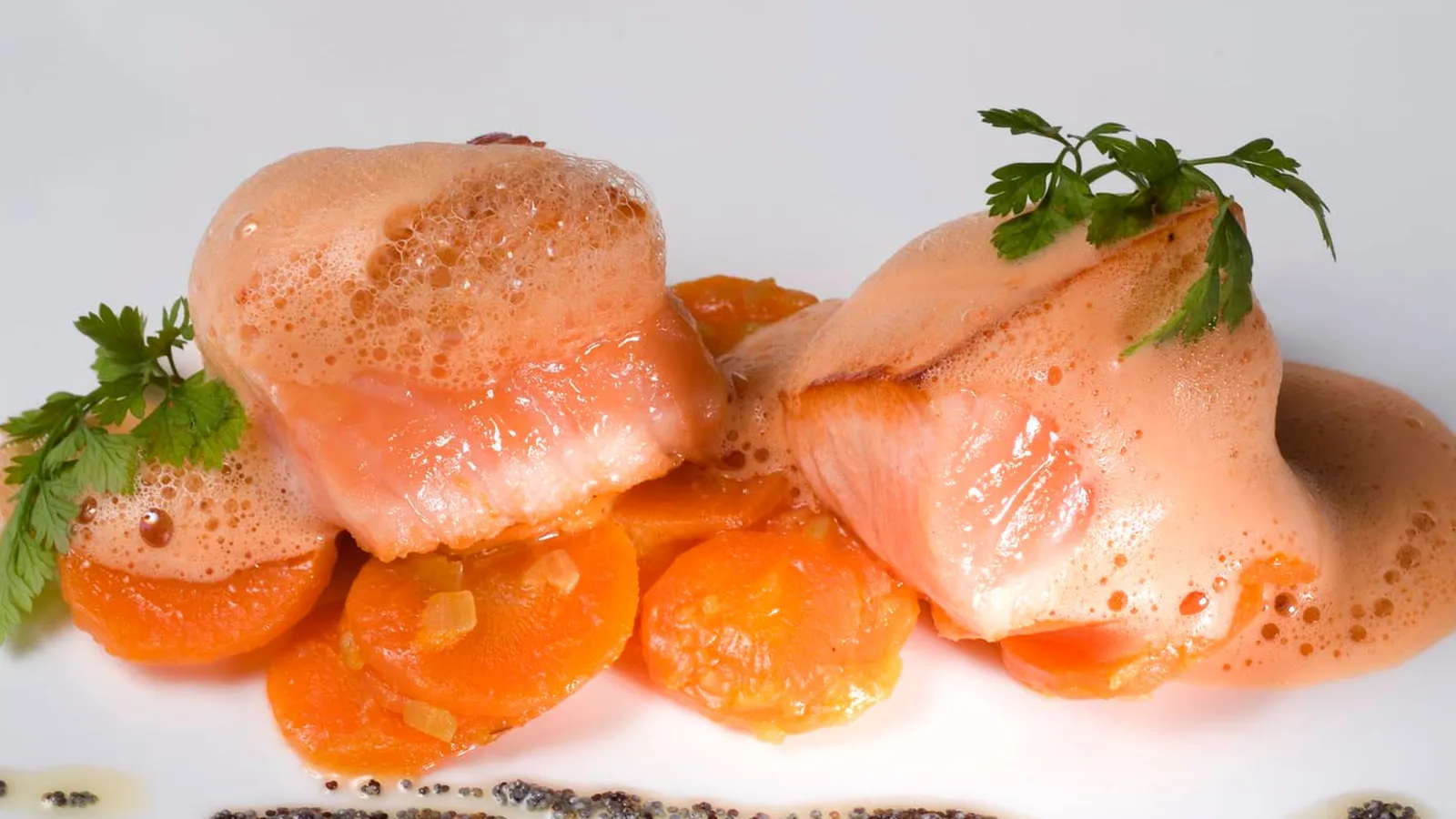 Receta de lomos de salmón dorados a la sartén con una espuma de zumo de zanahoria y aceite de amapola.