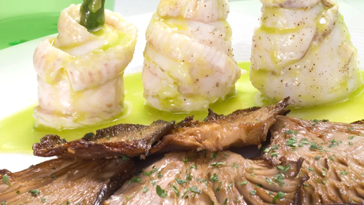 Sirve en cada plato 3 popietas acompañadas de 5 setas y salsea con el aceite de espárrago.