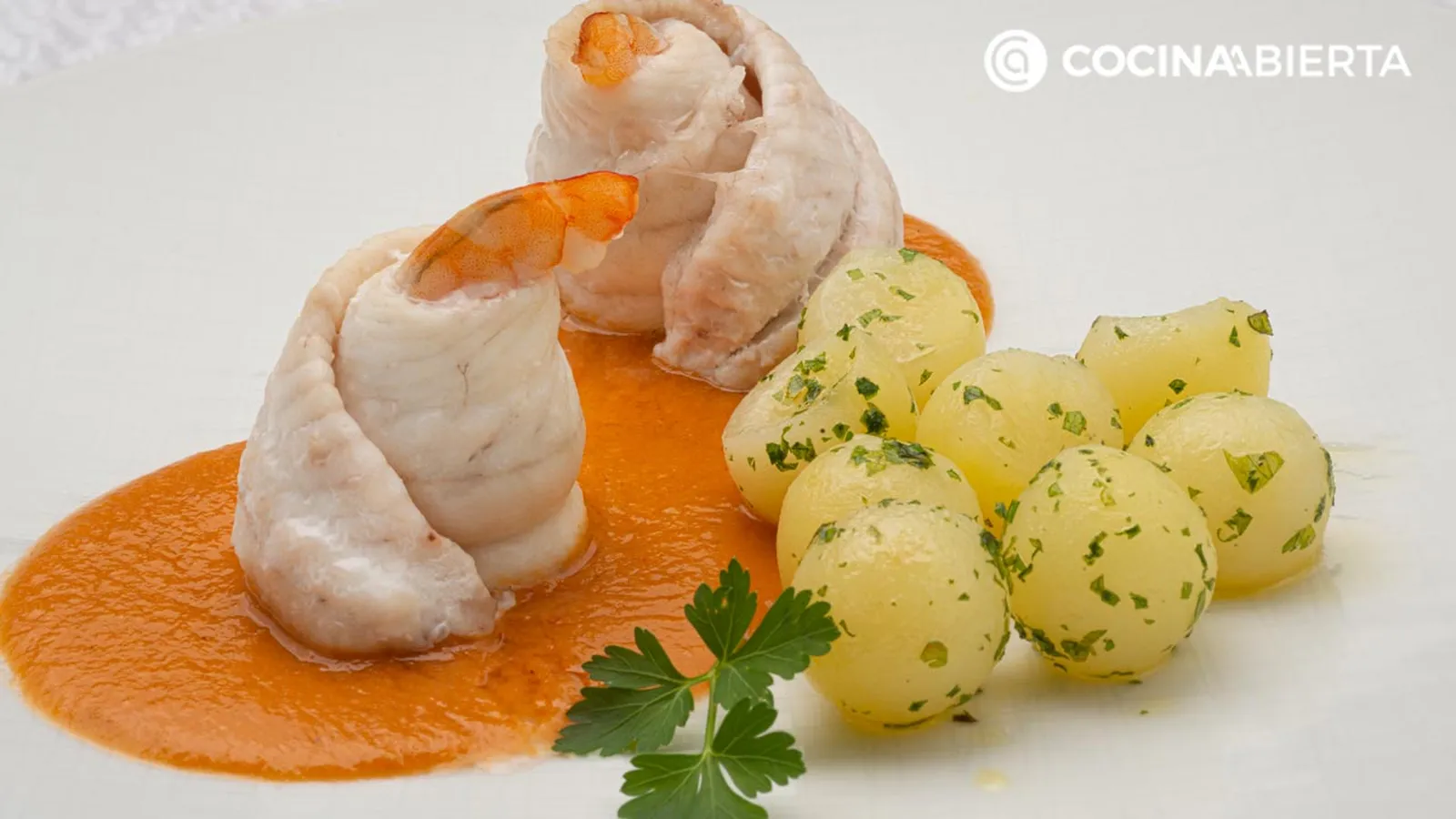 Sirve la salsa en el fondo de 4 platos y coloca encima de cada uno, 2 popietas de pescado y unas bolitas de patata. Adórnalos con unas hojas de perejil.