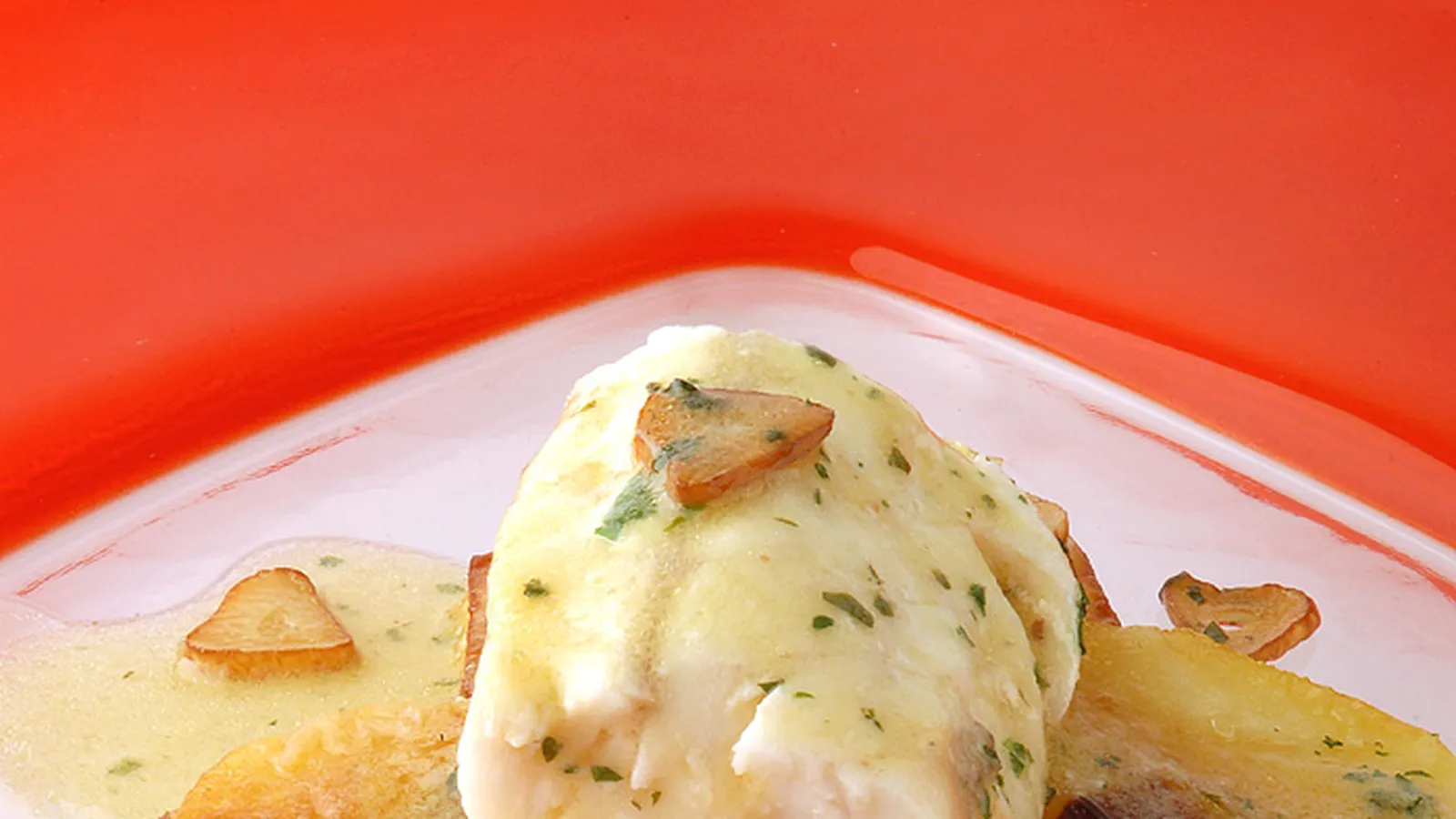 Sirve el pescado en una fuente amplia, liga la salsa al calor y riega el rape.