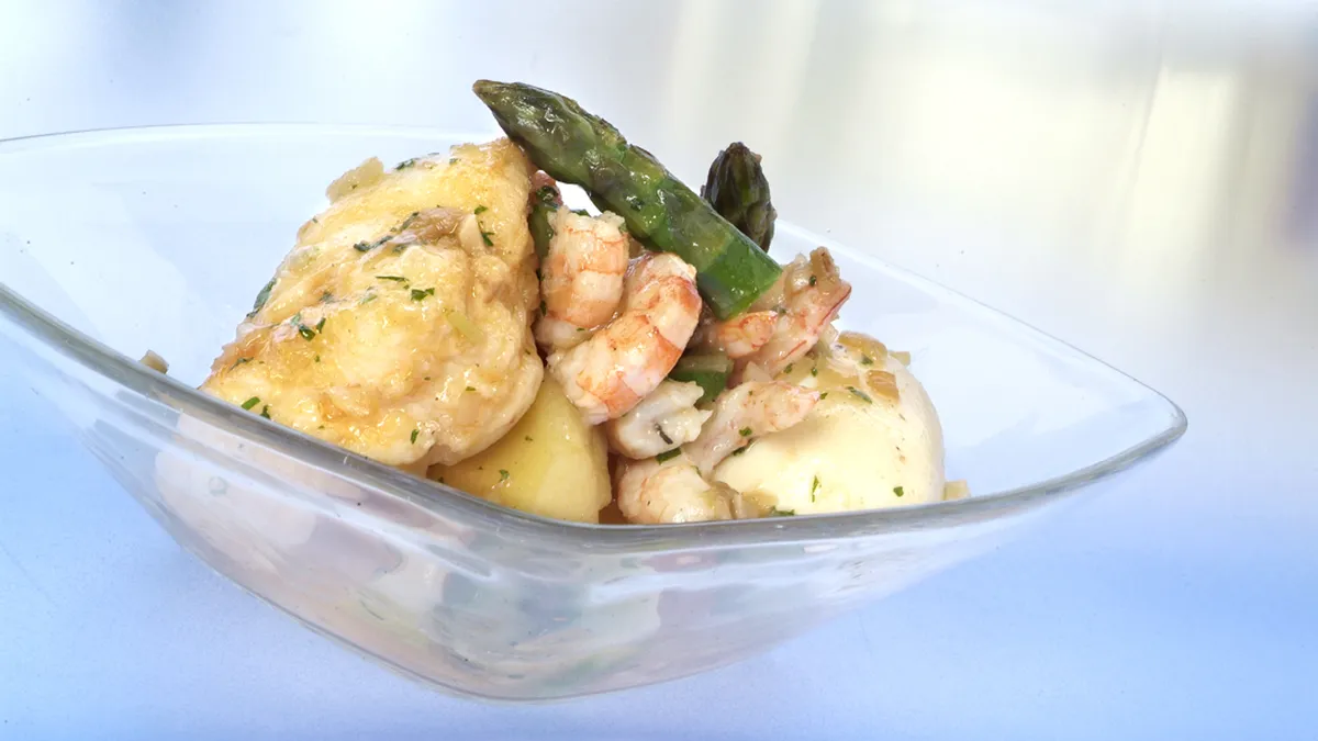 Receta de rape rebozado y guisado en un caldo de pescado con gambas y patatas. Plato elaborado por Eva Arguiñano en Hoy cocinas tú.