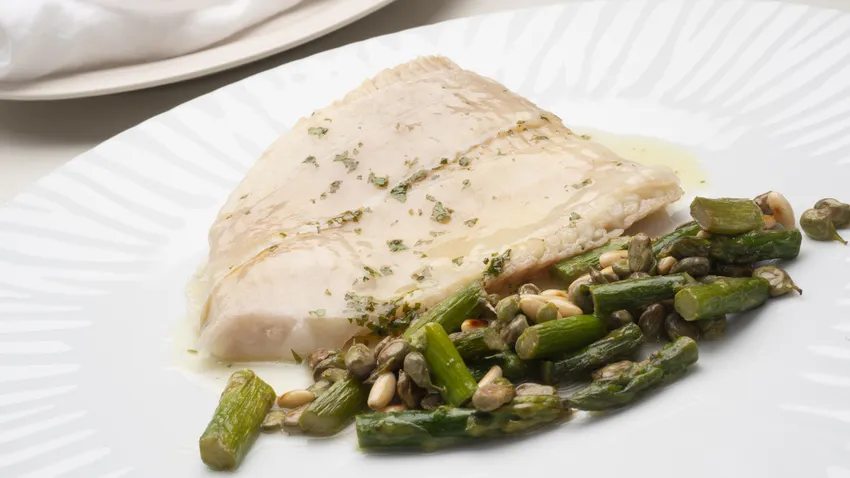 Raya al horno con habas y espárragos verdes