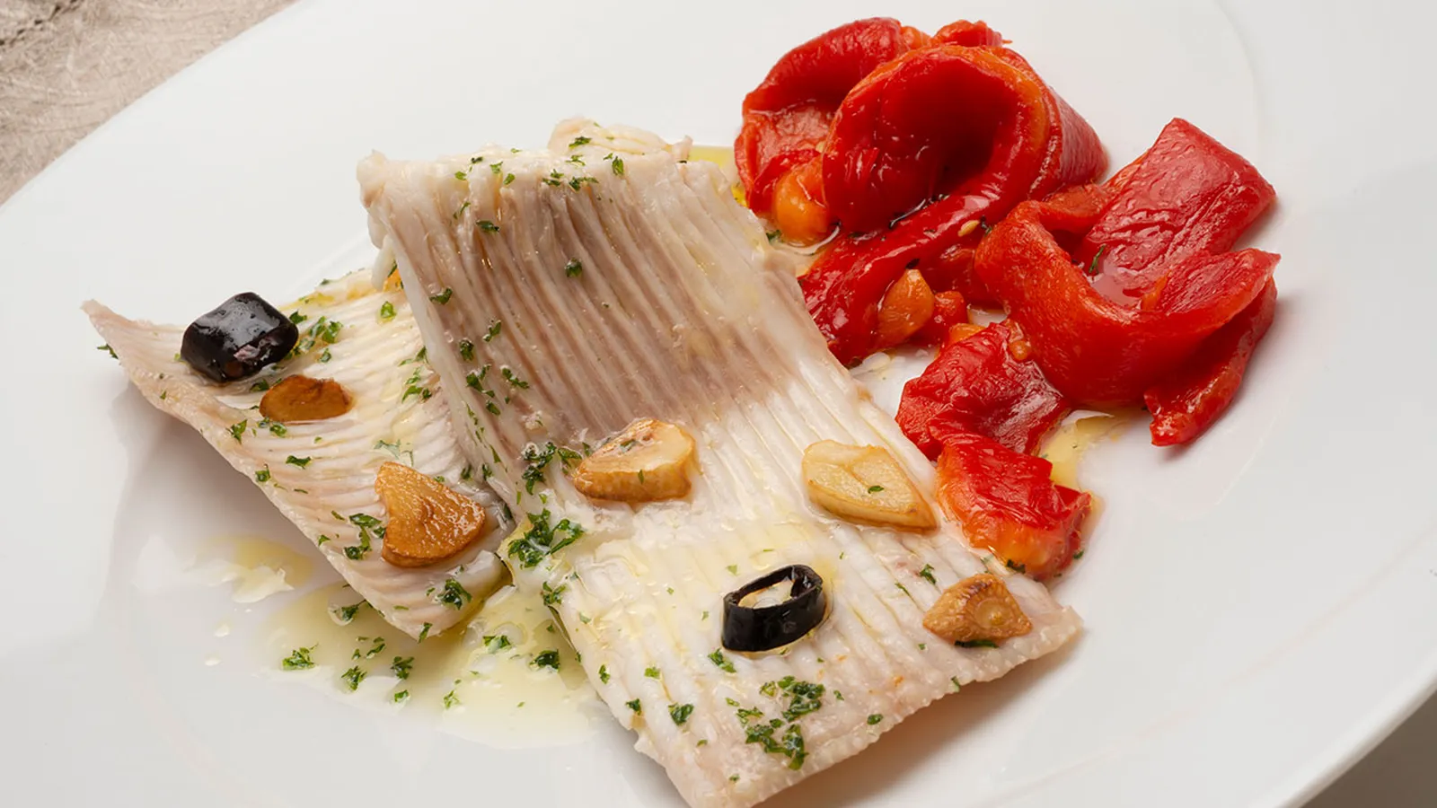 Sirve 2 trozos de raya en cada plato y unas tiras de pimiento.
