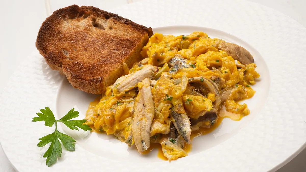 Sirve el revuelto y acompáñalo con las rebanadas de pan. Si os gusta el ajo, podéis untar las rebanadas de pan con un diente de ajo. Podéis decorar los platos con unas hojas de perejil.