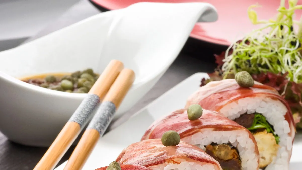 Una receta de sushi con arroz, jamón ibérico y el toque mediterráneo de la albahaca.
