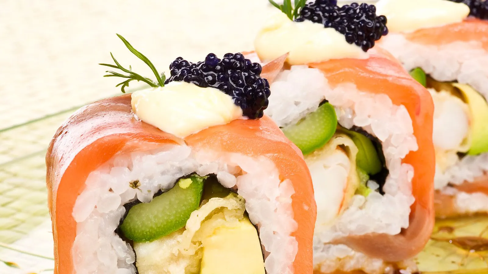 Rollito de langostinos rebozados en tempura y envueltos en salmón ahumado. Un plato de cocina oriental elaborado por el chef Iwao Komiyama.