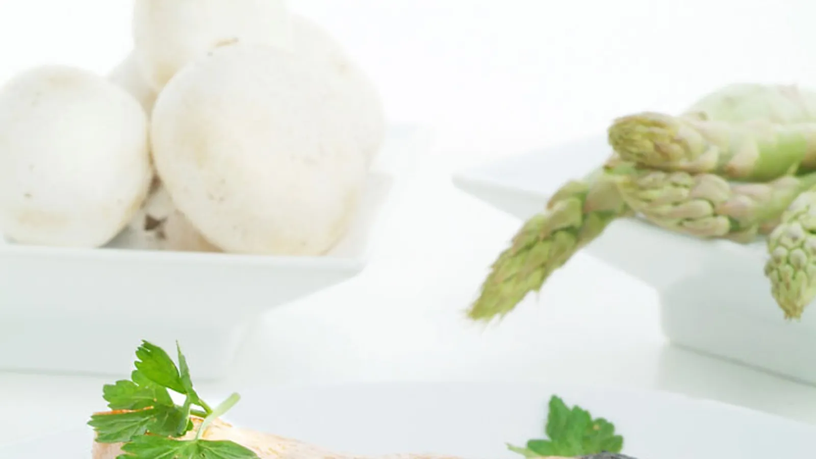 Limpia los champiñones, retírales parte del tallo y pártelas por la mitad. Limpia también los espárragos y retírales la parte más dura del tallo. Asa a la plancha estas verduras.