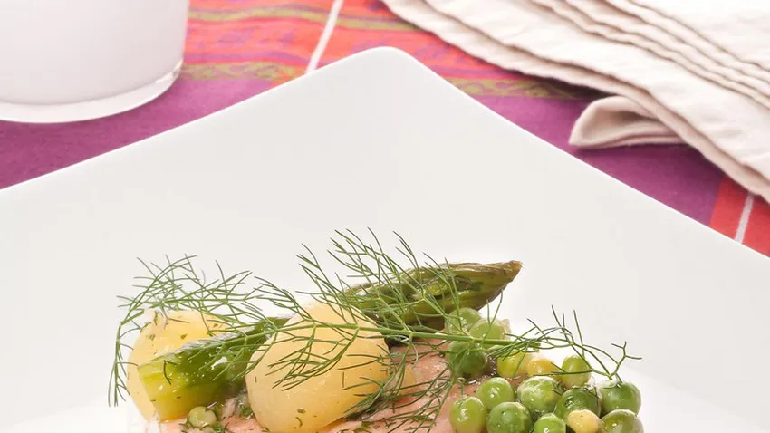 Retira la piel del salmón y coloca el lomo limpio en un plato con las verduras. Decora con un poco de eneldo.