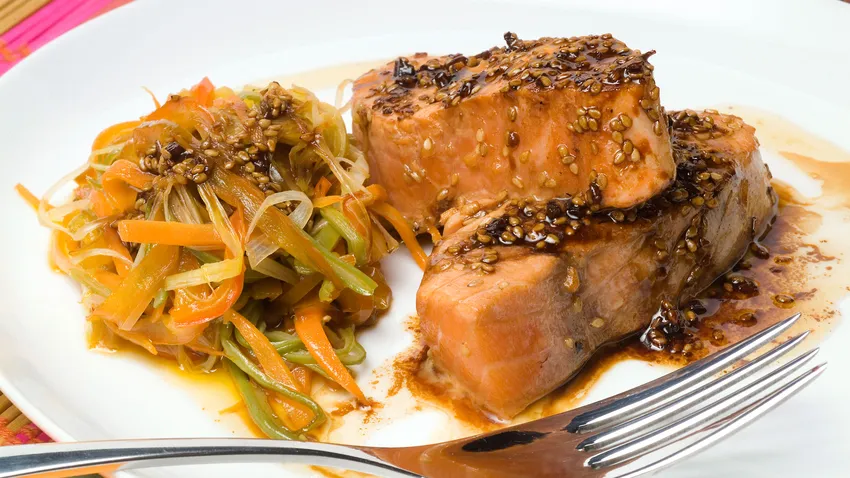 Receta de lomos de salmón al horno macerados en salsa de soja, jengibre y semillas de sésamo. Acompañaremos el pescado con unas verduras pochadas.