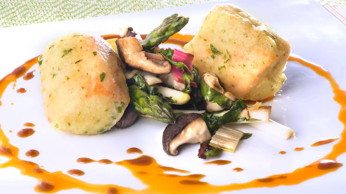 Sirve el salmón en tempura de hierbas sobre el salteado de verduras. Salsea el plato con la salsa.