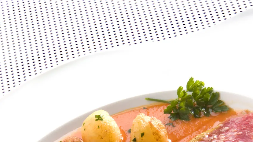 Salpimienta los salmonetes y fríelos en una sartén con aceite. Sirve la salsa en el fondo del plato y un salmonete por ración. Acompaña con las patatas y decora el plato con una hoja de perejil.