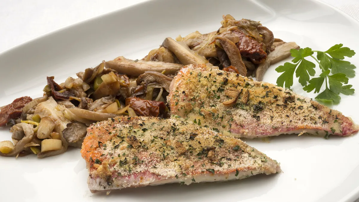Sirve los salmonetes y acompáñalos de las setas. Decora con una hojita de perejil.