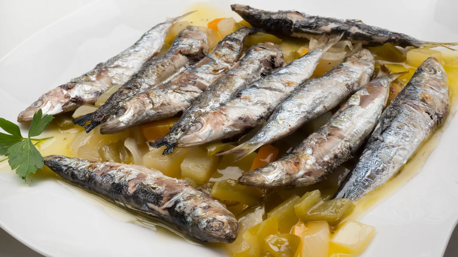 Sirve las sardinas y adorna con unas hojas de perejil. Acompaña con el escabeche.