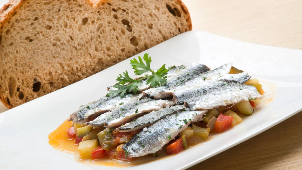 Receta de Karlos Arguiñano de sardinas asadas al grill en el horno acompañadas de pisto de calabacín, pimientos, cebolla y tomate.