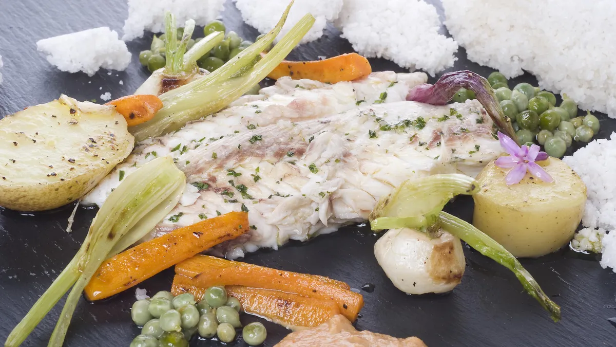 Sargo a la sal con verduras y salsa romesco