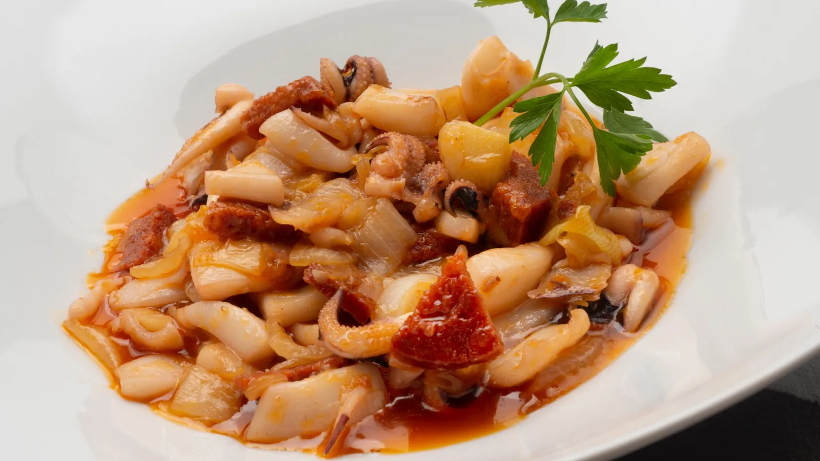 Agrega la sepia y cocina todo junto durante 5 minutos más. Sirve 4 platos y adórnalos con unas hojas de perejil.