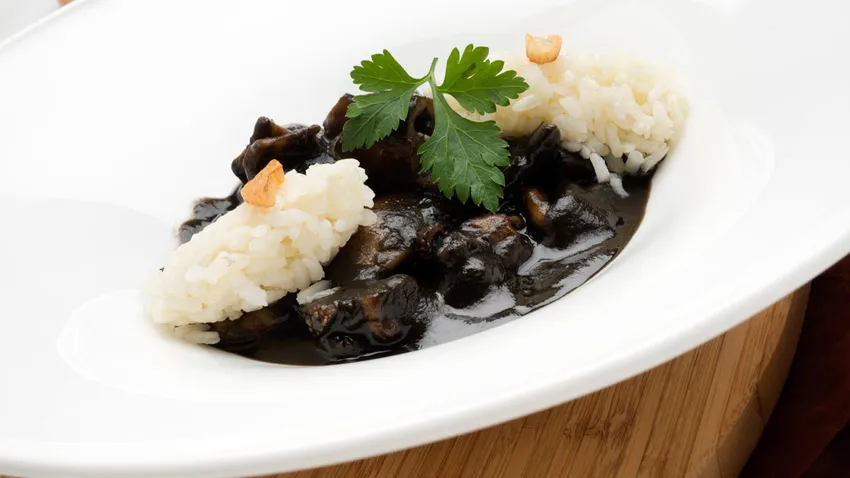 Receta de Karlos Arguiñano de sepia en su tinta cocinada en la olla rápida acompañada de arroz blanco.