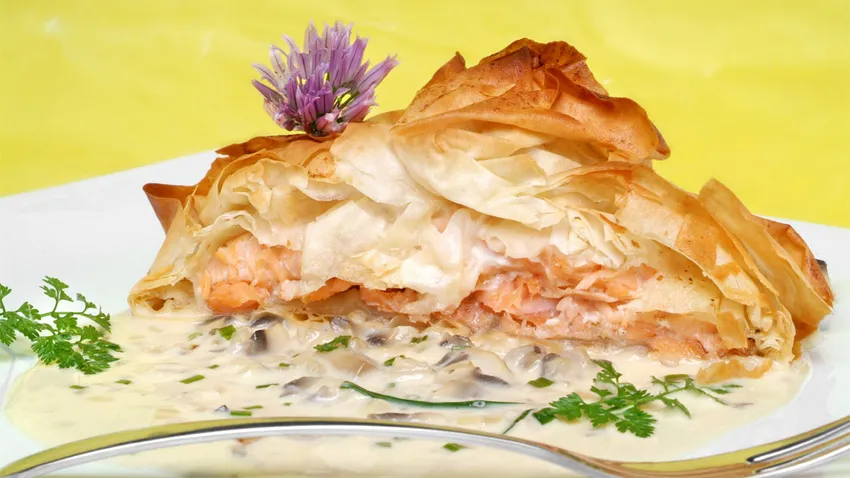 Coloca dos láminas de pasta filo en forma de cruz y úntalos con 60 gr. de mantequilla clarificada. En el centro, pon el disco de hojaldre pinchado con un tenedor. Encima pon las lonchas de salmón ahumado y tapa con otra lámina de filo. Unta ésta también con la mantequilla clarificada y pon encima el salmón fresco fileteado. Salpimienta y cierra el paquetito. Unta con mantequilla e introdúcelo en el horno a 200º C., durante 8 minutos.