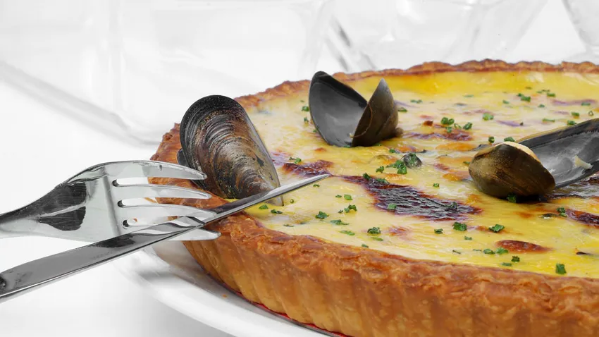 Prepara una rica tarta de hojaldre rellena de mejillones y sorprende el paladar con su suave sabor a queso emmental y verduras.