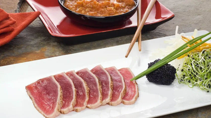 Receta estrella de la cocina oriental con atún rojo y plátano y con un toque picante.