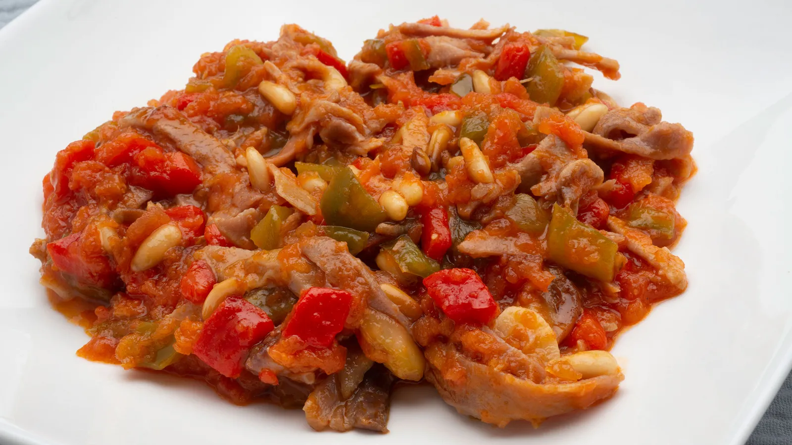 Pela el pimiento rojo y pícalo en daditos pequeños. Pica también los pimientos verdes y ponlos (rojo y verdes) a rehogar en la misma tartera donde has rehogado la tonyina, los ajos y los piñones. Cocínalos durante unos 15 minutos a fuego suave.