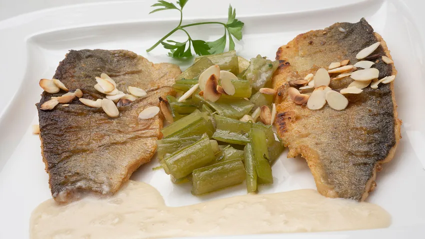 Elaboración de la receta Trucha con borraja y salsa de almendras: