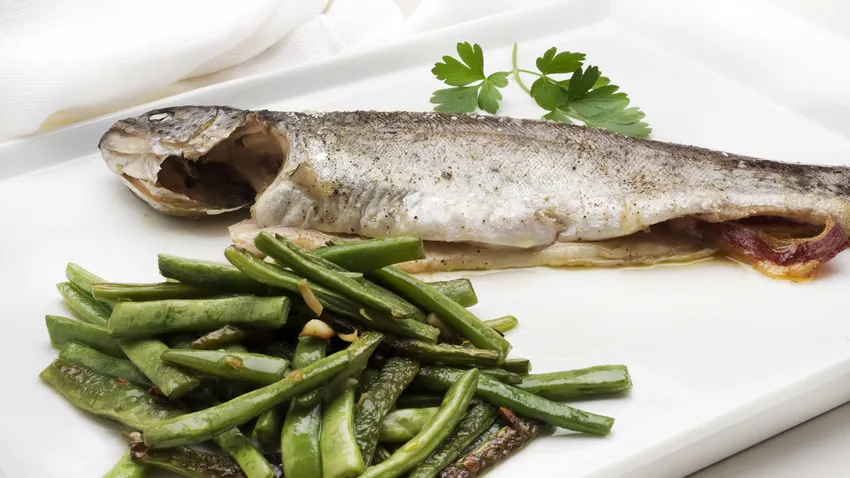 Sirve en cada plato una trucha y una porción de vainas. Adorna con unas hojas de perejil.