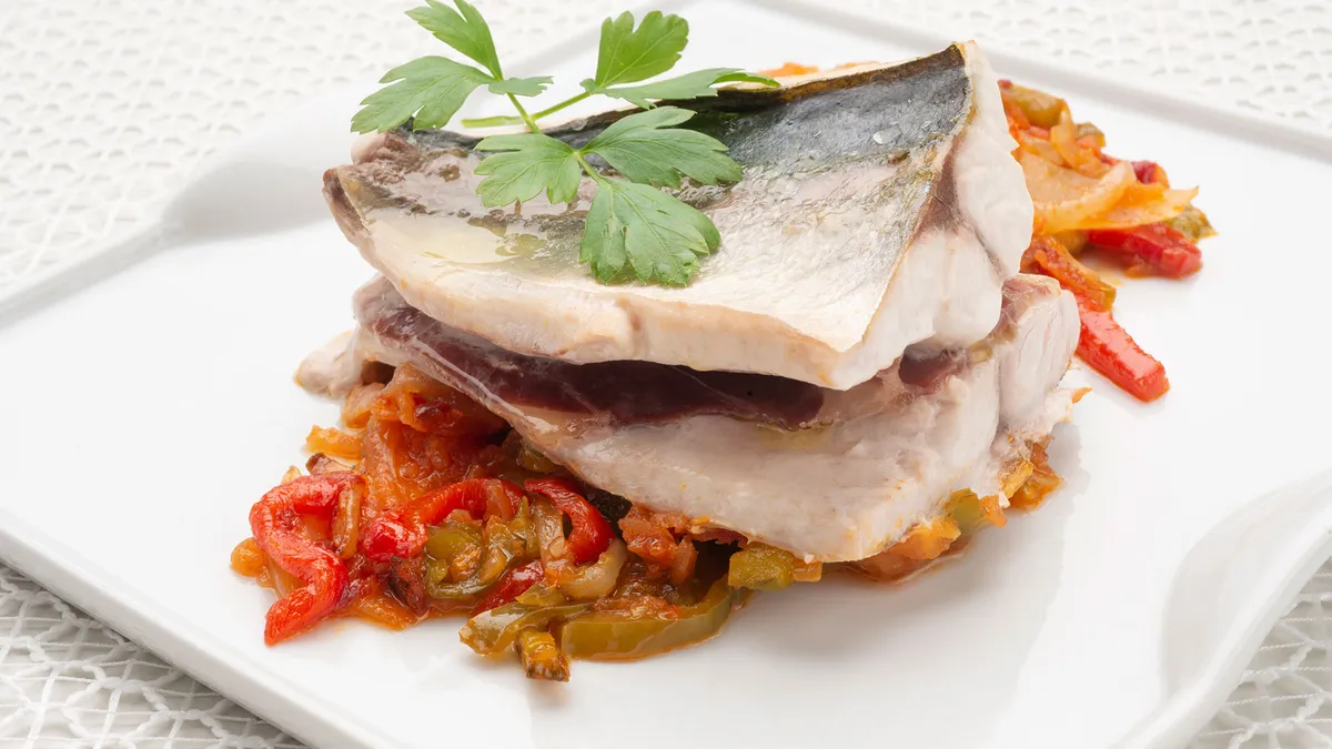 Sirve en cada plato 1 ración de pescado y una porción de piperada. Adorna los platos con unas hojas de perejil
