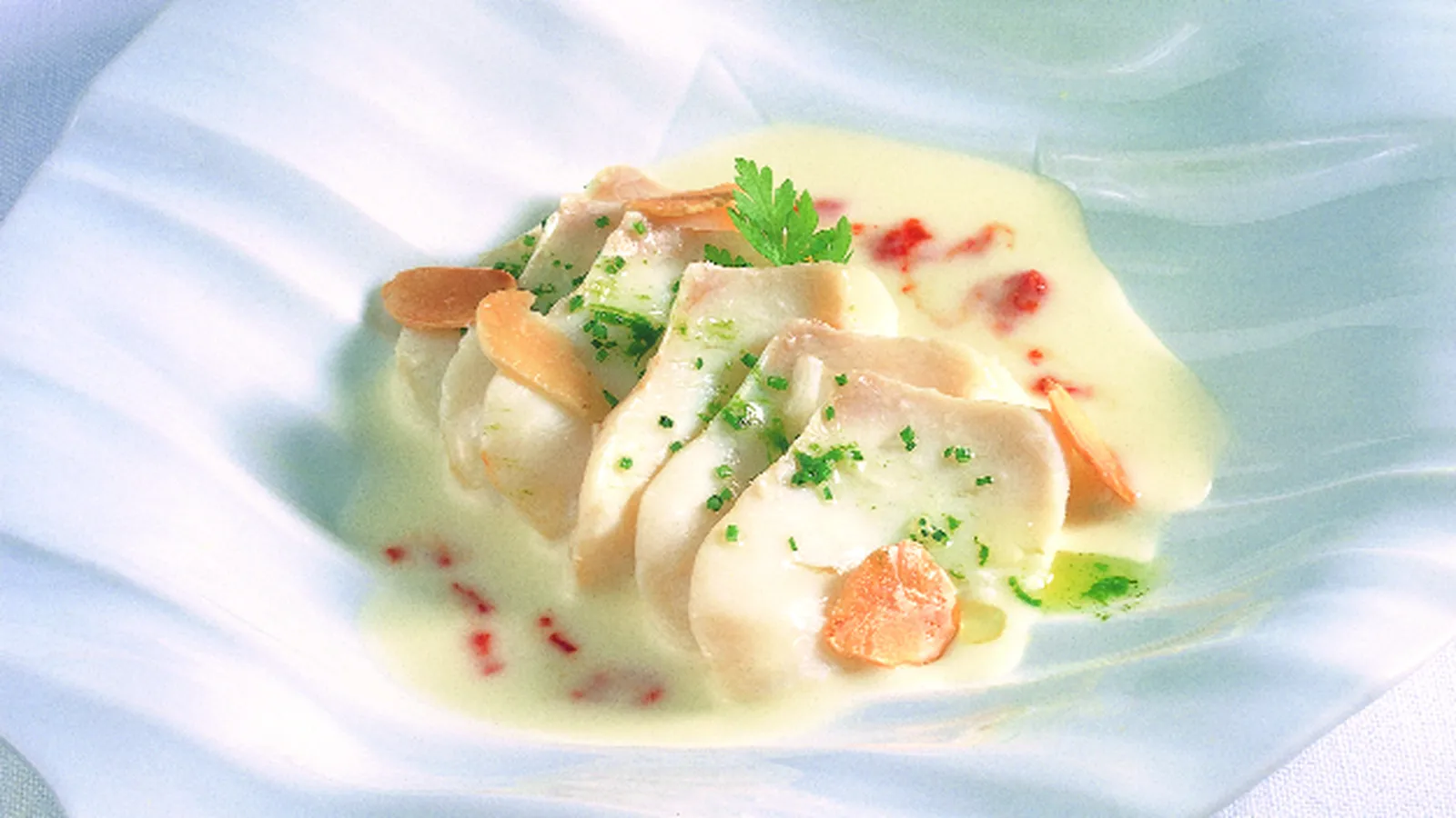 Prepara en la base del plato unas cuantas cucharadas de la vichyssoise y sobre ella dispón las láminas de bacalao. Decora con las almendras laminadas y el picadillo de pimiento. Espolvorea por encima del bacalao el perejil picado.