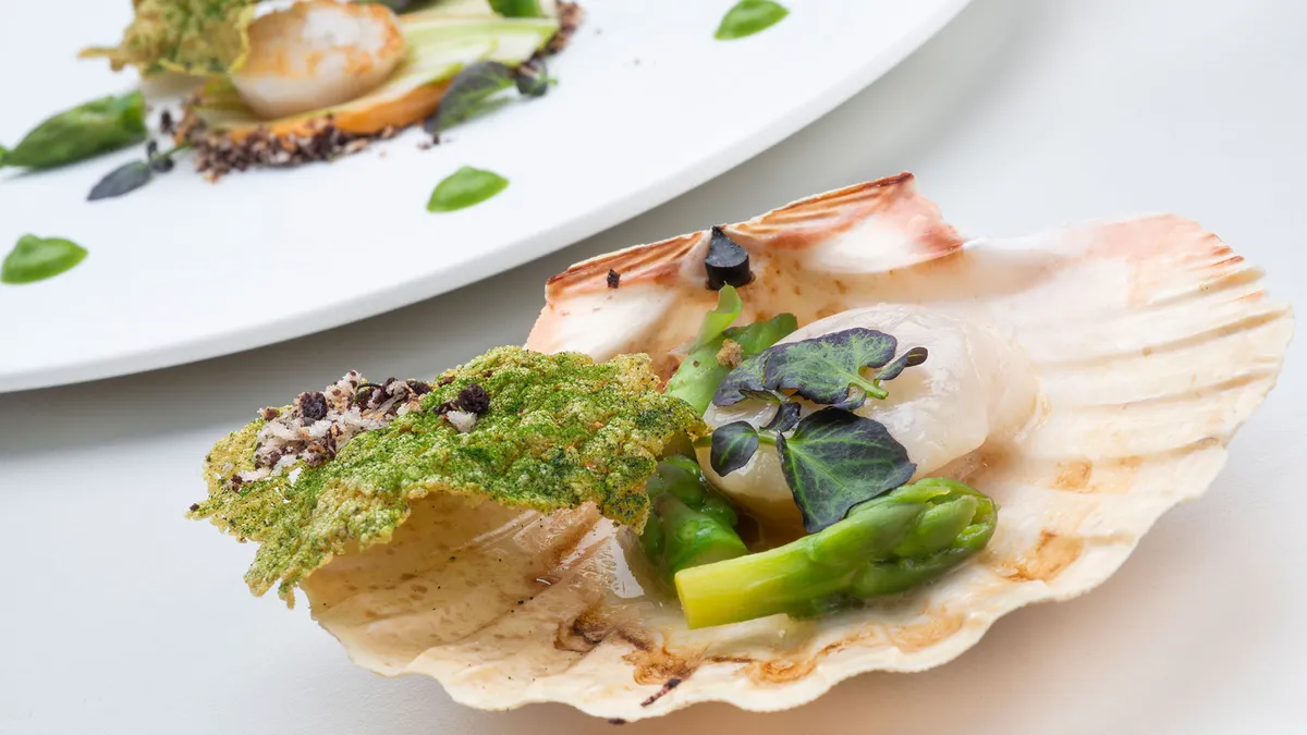 Vieira con crema de Erizo y crujiente de alga Kombu