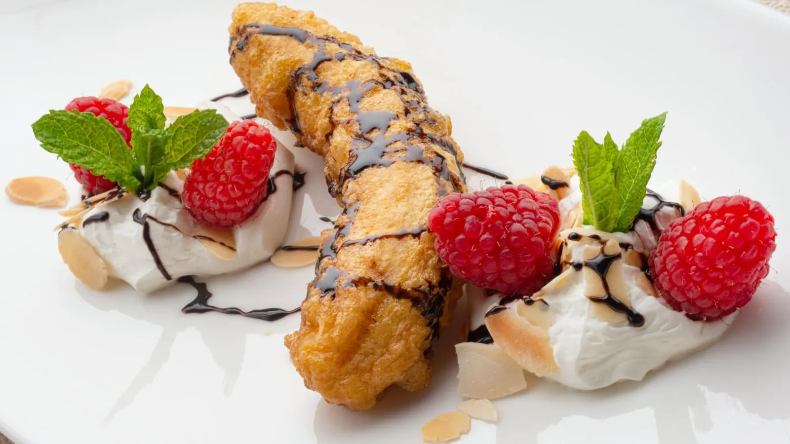 La elaboración no tiene complicación: plátanos rebozados en harina y huevo, fritos en aceite aromatizado con cáscara de naranja. Para acompañar, nata montada, frambuesas, sirope de chocolate y almendras laminadas.